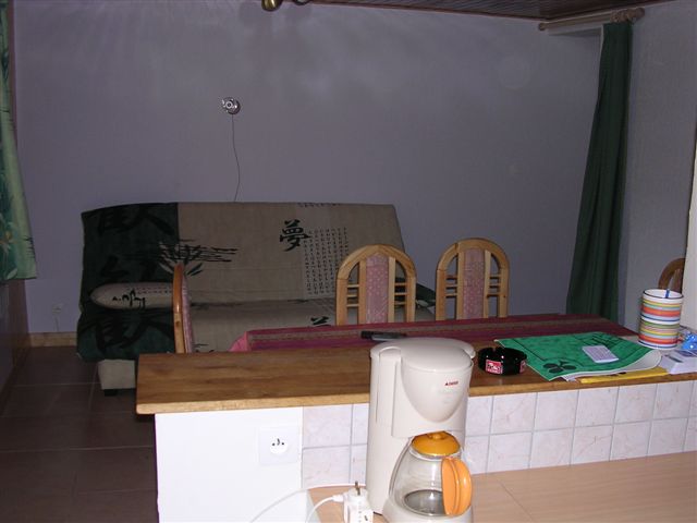 - Salon avec clic-clac de 140X190, une table + 4 chaises + banc, une télévision (6 chaînes françaises).